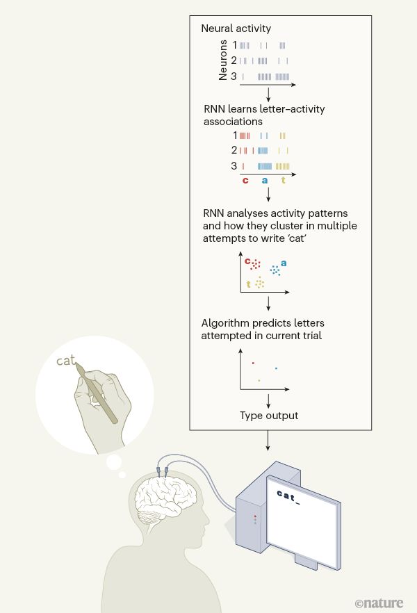 图1:Willett等人开发的脑机接口技术,能够通过预测神经活动,将瘫痪患者脑海里想象的打字内容转换为电脑屏幕上的文本。在用户想象要写的字母时,植入大脑的电极可以测量许多神经元的活动(线条表示每个神经元发射的时间点)。递归神经网络(RNN)学习每个字母产生的神经活动模式,并分析这些活动模式在多个试验中的关系,从而生成聚类图。算法会使用此信息来预测当前试验中参与者所想象的字母,并将该预测转换为印刷输出。