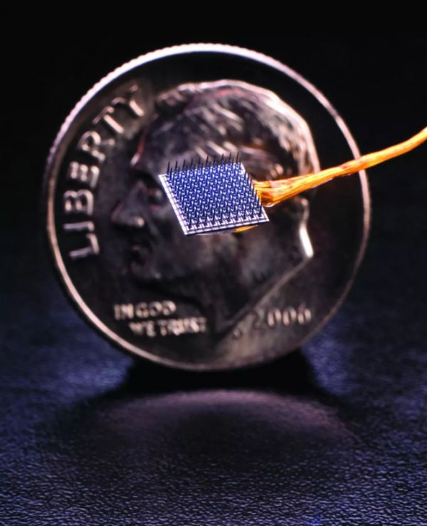 图注:植入大脑的微型电极阵列(来源:BrainGate)