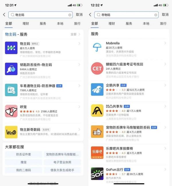 但由于本人自我脑补能力太强,把「物主码」记成了「寻物码」,不小心就走到了错误的页面。但这种错误让我发现,想要帮我找东西的服务还真不少。寻找场景特别精确的有四六级准考证号找回;潜在用户十分多的宠物防丢寻狗服务;由杭州市公安局提供的失物寻找高效匹配的便民服务。