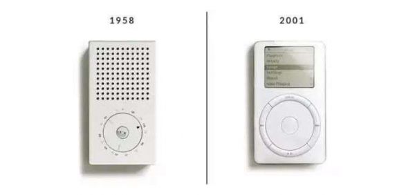 左边是 1958 年的 T3 收音机,右边是 2001 年的 iPod,都是极简设计的产品