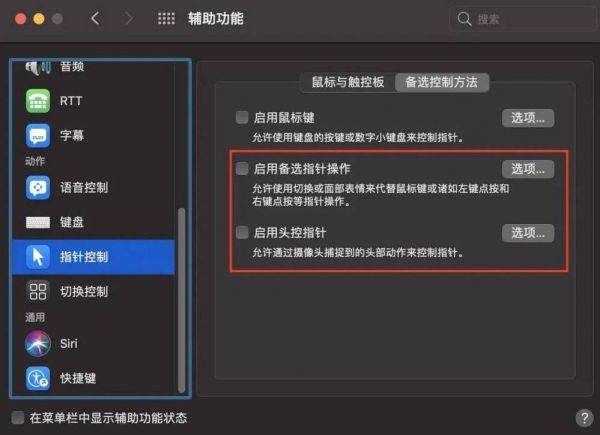 如果想体验该功能,可以在“系统偏好设计”—“辅助功能”—“指针控制”—“备选控制方法”,然后勾选“启用头控指针”选项。