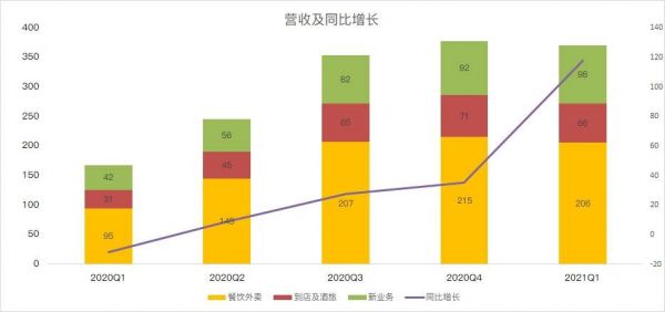 具体来看,餐饮外卖业务依然是创收的主力,餐饮外卖业务收入同比增长116.8%至206亿元,收入规模扩张也推动该部门同比扭亏为盈,餐饮外卖业务由去年一季度亏损7090万元变为2021Q1盈利11亿元。