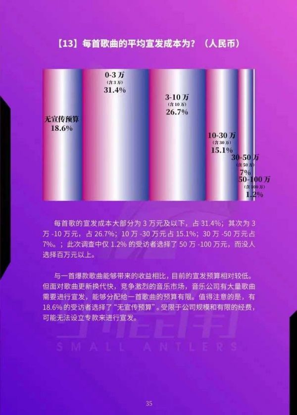 可成本对绝大多数音乐人和公司来说都是软肋。报告中,18.6%的受访者表示“无宣传预算”,高达31.4%的受访者宣发成本在3万元以下,占比最高。调查中,仅1.2%的受访者能负担50到100万的宣发费用。