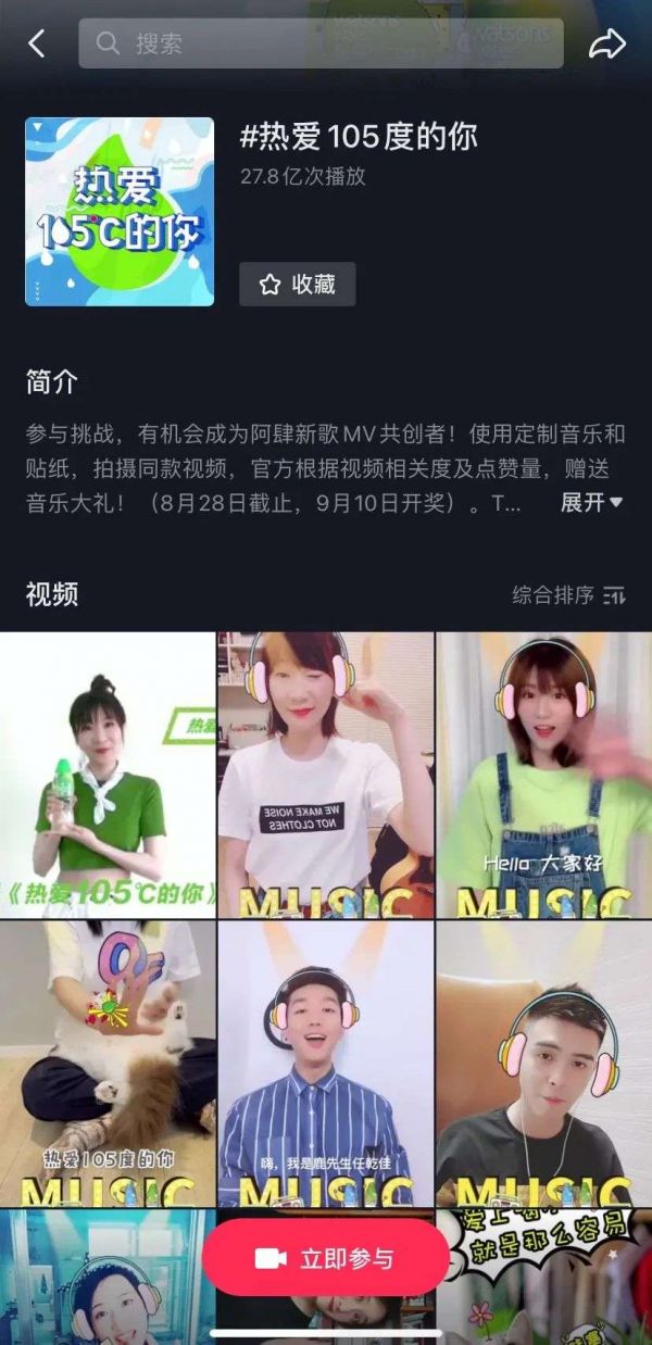 歌手阿肆2019年创作的《热爱105度的你》,在抖音掀起一波翻唱热潮,加上方言版翻唱,搭配手势舞、合唱、编舞等进一步破圈,在抖音至今已积累27.8亿次话题播放量。