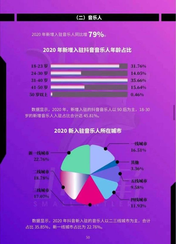 为了更好地“被看见”,越来越多的音乐人,尤其是善于利用新媒体的年轻音乐人,主动聚集在短视频平台。据本次研究报告统计,2020年新增入驻抖音音乐人同比增长79%,其中以90后为主,18-30岁的新增音乐人入驻占比合计达45.81%。