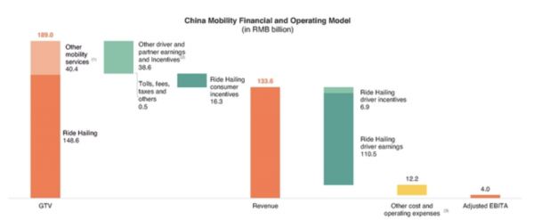 而滴滴在招股书里也披露了2020年的国内业务的具体构成,这帮助大家直观看到如今滴滴的补贴占整个业务的比例,以及网约车的营收情况:1890亿GTV里,1486亿来自网约车服务,对应的“乘客补贴”为163亿,加上其他费用,这样录得营收为1336亿。而对应的,司机从中获得收入为1105亿,平台补贴给司机69亿,再刨去其他支出,最终的经调整EBITA为40亿人民币。经计算,网约车业务的息税摊销前利润率为3.1%。