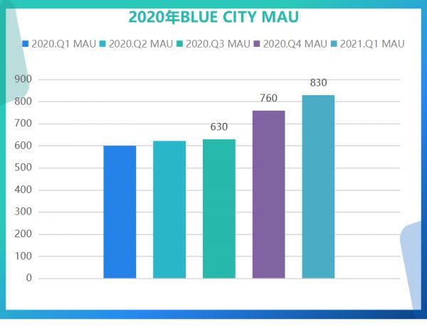 根据财报数据,BLUE CITY 2021 年 Q1 的 MAU 为 830 万,同比增长 37.5%,环比增长 9.2%。付费用户总数为 64 万,同比增长 47.8%,较 2020 年 Q4 的 51.8 万环比增长 23.6%。整体来看,同比环比都在稳健增长。