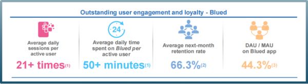 另外,再分享一些有趣的数据。根据财报数据,Blued 平均每个用户日均会话次数为 21 次、用户日均使用时间为 50+ 分钟、月留存率 66.3%、DAU 在 MAU 中的占比为 44.3%。