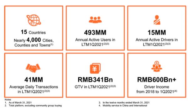 在截至2021年3月31日的12个月里,滴滴全球平均日交易量为4100万单,全平台总交易额为3410亿元。2018年1月1日至2021年3月31日的3年时间内,平台司机总收入约6000亿元。