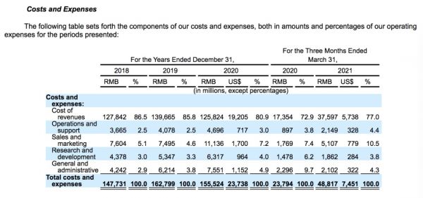 截至2020年12月31日,滴滴在全球共15914名全职员工,其中研发员工7110名,研发员工占比44.7%。其中研究与开发的费用分别为44亿、53亿和63亿元,2021年第一季度近19亿元人民币。