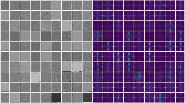 ▲从100个生成模型中每一个生成的图像在左边产生一个估计的指纹,在右边产生一个相应的频谱。许多频谱显示出不同的高频信号,而有些频谱看起来彼此相似。