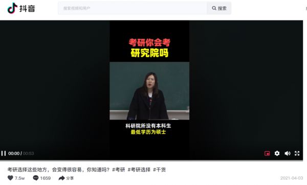 比如说,很多的科研机构、教育机构会利用抖音的平台影响力发布一些知识类、教育类内容,而学生群体也会在抖音上学习新的知识。同时,相对的严肃内容在制作上会更多地以横向内容为主,而这些内容放在手机抖音上,则会出现显示上的问题,所以抖音便顺势推出网页版平台,让横向的、严肃类的内容有更好的观影体验。