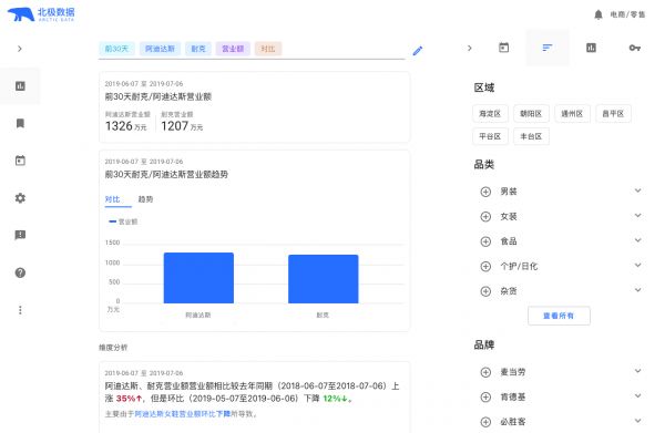 用户使用几乎零门槛。如主流的BI产品形态基本为可视化看板/报表,但北极数据的产品只需用户直接输入问句,大大降低用户使用门槛。刘沂鑫表示,以简单的“xx品牌在某商场的年销售额”为例,在传统BI产品上可能仍需要8到10步的托拉拽步骤。想学会使用数据分析产品的仍需一定量的培训,因此当前绝大部分使用BI产品的还是数据分析师,离业务人员仍有距离。 部署方便。并且,北极数据产品基于云原生架构研发,在部署层面采用docker方式,在客户数据库中自动建立索引,几乎做到开箱即用。对于企业而言也大大减少了部署成本。目前据北极数据估算,使用北极数据产品后能够减少数据分析师80%的工作量,相比传统BI,ROI提升2000%。 能够敏捷灵活地获取数据,且包括实时数据,耗时在秒级级别。如果业务人员希望通过传统BI产品获得数据支持,仍需先与数据工程师沟通需求,最后才输出相应的数据报表。刘沂鑫表示,在北美,这样的数据获取和支持流程平均耗时在4.8天,这在很大程度会拖慢一线业务人员的工作进度。此外,由于北极数据是通过建立索引来获取多源异构数据,在数据分析的侧重点上也和传统BI产品不同。刘沂鑫介绍,比如在涉及一对多的查询时——如不同品牌间,或许同一品牌在不同时间段的对比,北极数据能够做到及时响应,而传统BI产品较为擅长一对一的比较,一对多查询则是弱势,这也是北极数据的壁垒所在。