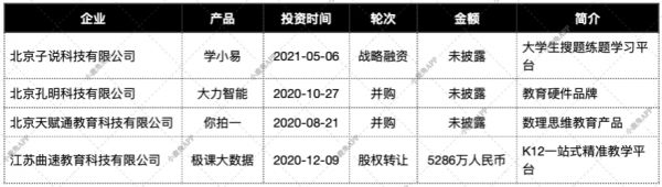 2020年至今,自己跳动在教育方面的投资进行了四笔,范围从幼儿到K12再到大学生,涵盖了各个年龄段的教育平台。还有大力智能,提供学习灯灯硬件产品和智能辅导软件产品,以此辐射更多教育应用场景。