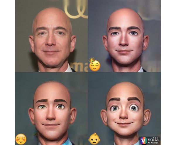 硅星人用Volia根据贝佐斯公开照片制作的气质版(右上)、正常版(左下)、宝宝版(右下)3D卡通特效