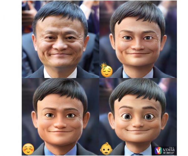 硅星人用Volia根据马云公开照片制作的气质版(右上)、正常版(左下)、宝宝版(右下)3D卡通特效