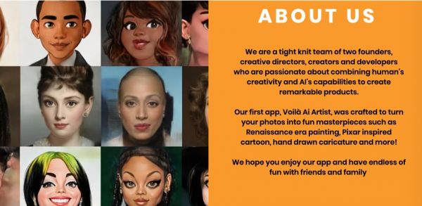 那么是谁突然推出了Voilà AI Artist呢?其幕后是一家名为Wemagine.AI的公司。这家公司今年一月才正式于英国伦敦登记注册,成立不到两个月就推出了这款App。目前网络上几乎没有关于这家公司和团队的信息。其官网主页也非常简单,除了表明自己是Voilà AI Artist的创作者外,只介绍说他们是一群热爱将人工智能技术跟创意相结合的小团队,且有两个主要发起人。Voilà AI Artist是他们的制作的第一个App。