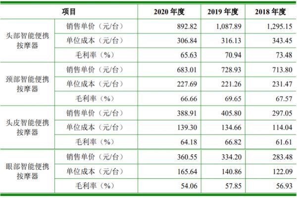 在倍轻松主打的四大产品体系中,近两年,头部、颈部和头皮智能便携按摩器销售单价和毛利率均有所下降。其中,头部智能便携按摩器更是在三年内下降402.33元,降幅达到31%,而期间产品单位成本降幅只有10%左右,这也导致产品毛利率也从73.48%下降至65.63%。颈部和头皮智能便携按摩器更是在单位成本增加的基础上,调低了售价,导致毛利率下降。