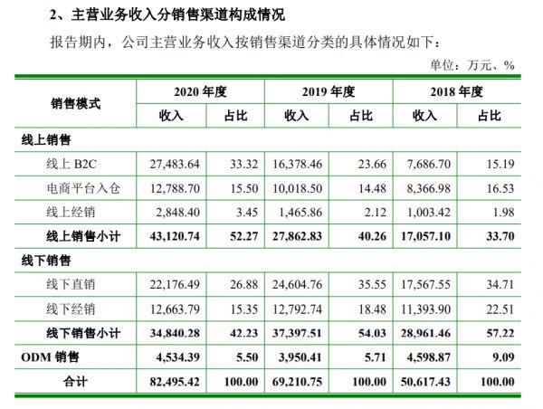 根据招股书,倍轻松目前主要采用“计划生产”和“订单生产”相结合的模式进行生产。后者主要针对其ODM代工加工业务,前者是根据对未来某段时间内市场所需产品种类和数量的预估来确定的。而这种生产模式,将与其越来越依赖的线上销售方式发生冲突。