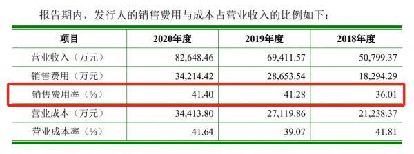 根据招股书,2018-2020年,倍轻松的销售费用分别为1.83亿元、2.87亿元、3.42亿元,总计高达8.12亿元,销售费用率分别为36.01%、41.28%、41.4%,销售费用率远高于行业平均水平。公开资料显示,2020年度,可与倍轻松进行比较的智能硬件品牌奥佳华、石头科技、科沃斯的销售费用率分别为15.77%、12.36%、23.27%。