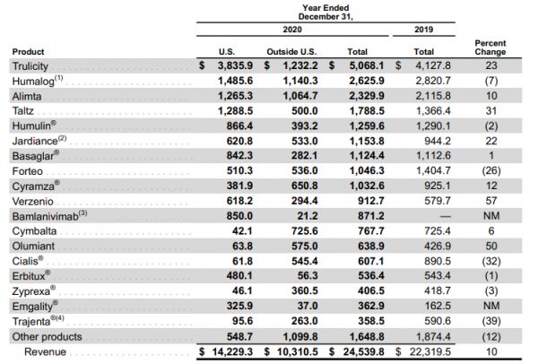 礼来药物销售情况,图片来源:礼来2020年年报