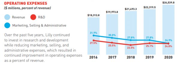 礼来历年运营成本(红线为研发投入占比)