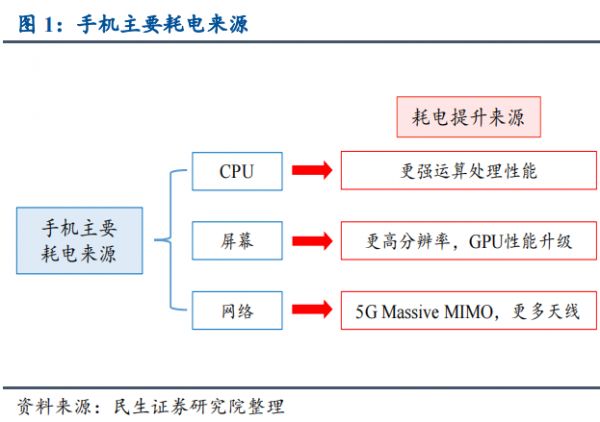 一方面,由于手机能耗上升,智能手机在CPU性能、芯片性能(5G手机芯片耗电速度将为4G的2.5倍)、屏幕分辨率等方面的不断升级使得手机耗电量大大增加,短视频、电商、手游等重度使用场景持续抢占用户时长,加快了手机耗电速度。