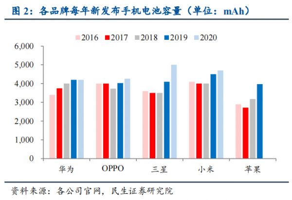 另一方面则是因为手机电池容量的升级空间狭窄,从近几年几大主流手机品牌所发布的手机来看,受限于锂电池本身物理特性以及手机机身大小、重量、散热性能、成本等因素,手机电池容量整体增速较慢。