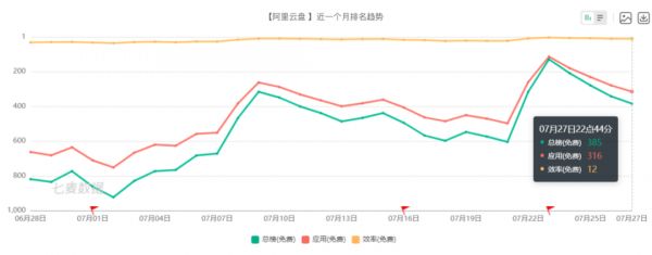 据七麦数据显示,最热的时候,阿里云盘在App Store总榜排名位居第2名。随后排名一路下滑。据最新数据,截至目前,其在App Store总榜排名已跌落至总榜385名左右。期间,在5月末时还曾一度跌至总榜1000名外。