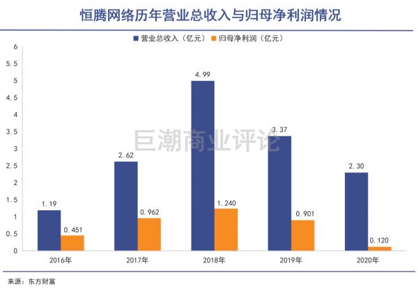 财务数据也可以印证恒腾网络多年来的经营困境:2016年,公司营业收入1.19亿元,净利润450.74万元,到了2020年年报,营业收入涨至2.3亿元,但净利润只有1200万元,连续两年业绩快速下滑。