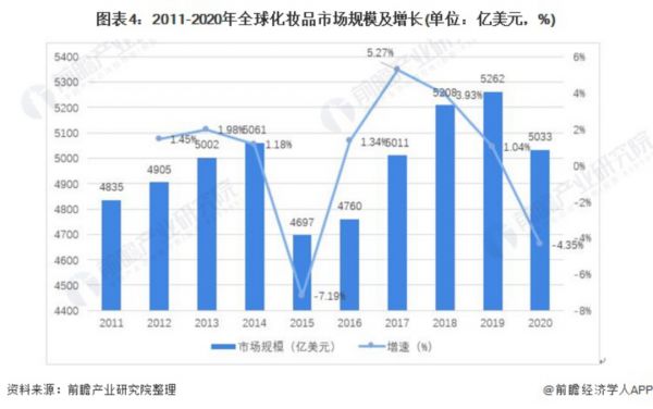 根据Euromonitor数据统计显示,2017年全球化妆品市场规模为5011亿美元;受疫情影响,2020年全球化妆品市场规模较2019年的5262亿美元有所下降,为5033亿美元。