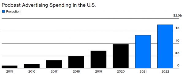 行业贸易组织美国互动广告局(Interactive Advertising Bureau,IAB)的副总裁Eric John表示:“相对于视频流而言,播客仍然是一个新兴市场,但它的规模已经翻了一番。”IAB 预计,今年播客广告的收入将首次突破 10 亿美元,到 2023 年将翻一番,达到 22 亿美元。他说:“广告是亚马逊业务增长最快的板块。对于此类内容,他们的看法是这可以为对亚马逊宇宙的忠诚度创造一个入口。”