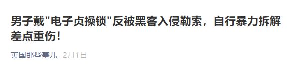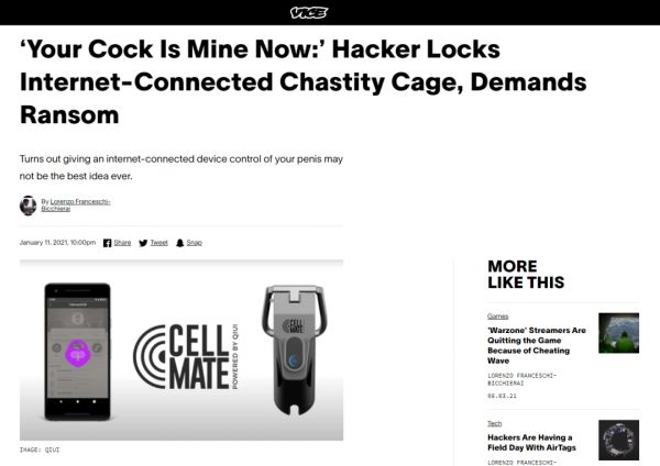[31] Lorenzo Franceschi-Bicchierai. ‘Your Cock Is Mine Now:’ Hacker Locks Internet-Connected Chastity Cage, Demands Ransom 2021.1.11 https://www.vice.com/en/article/m7apnn/your-cock-is-mine-now-hacker-locks-internet-connected-chastity-cage-demands-ransom