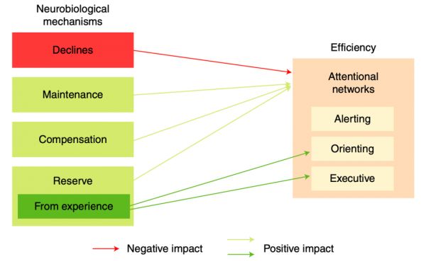 那么,从中年到老年,定向和执行抑制功能分别增加了多少?这些幅度增加在现实生活中是否具有实际意义? 令人惊奇的是,研究结果显示,年长者(90+)的定向的效率比中年人(50+)的样本增加了大约 4-5 倍,而 70 岁以上的爷爷奶奶的执行抑制效率也是中年人的大约 2 倍。 研究人员认为,这种幅度的增加有着本质性的现实意义。 尽管执行抑制功能会在 70 岁中后期明显下降,但无论如何也不会比中年人(50+)的表现更差。综合警觉性、定向和执行抑制三种认知功能,无论是准确性还是响应时间(RTS),大脑的执行效率事实上是随着年龄增长而改善的。这就意味着在空间导航、长期记忆编码和提取、决策、推理、数学能力和语言处理方面,老年人的认知能力并不一定比年轻人差。也有大量研究证明,双语者或音乐家这类在执行功能上有大量经验的人会随着年龄的增加而变得更加厉害。 那么,大脑到底为什么会在不同的认知功能中呈现出不同的变化呢? 研究人员认为,或许可以通过神经生物学的下降、维持、补偿和储备等综合机制来解释这一现象。警觉、定向和执行抑制功能依赖于不同的大脑区域和不同的神经化学物质,科学家们将它们视为相互独立的大脑网络。在生物机能不断老化的过程中,这些网络的维护和补偿机制并不相同。所谓维护和补偿机制,是大脑对机能衰退产生的应对模式。