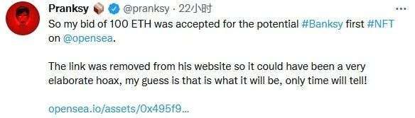 英国 NFT 收藏家 @Pranksy(Pranksy 仅是其推特用户名,并非本名)就是抱着如此心态被骗的。受骗者 Pranksy 是世界著名街头艺术家、人称“英国涂鸦教父” Banksy 的粉丝,因此如果有机会买到 Banksy 的第一个 NFT 作品那自然是求之不得。
