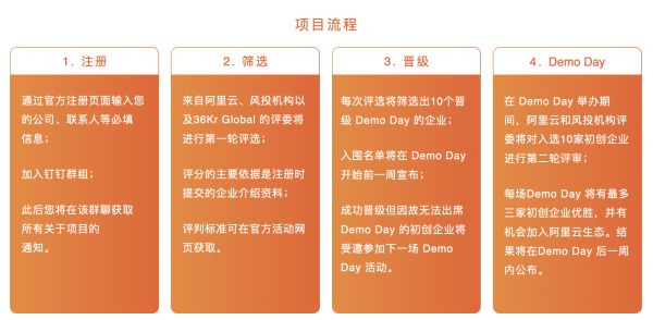 报名成功后将进入项目筛选阶段。评审团评委来自阿里云、风投机构和36Kr Global 的研究专家。筛选晋级 Demo Day 的项目时,评分主要依据注册时提供的企业介绍 PPT。点击活动官方网页查看项目筛选标准 。