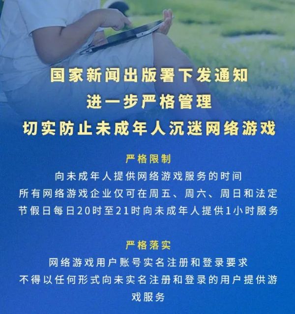 前段时间,国家正式出台了《关于进一步严格管理切实防止未成年人沉迷网络游戏的通知》。通知要求:所有网络游戏企业仅可在周五、周六、周日和法定节假日每日20时至21时向未成年人提供1小时服务,其他时间均不得以任何形式向未成年人提供网络游戏服务。