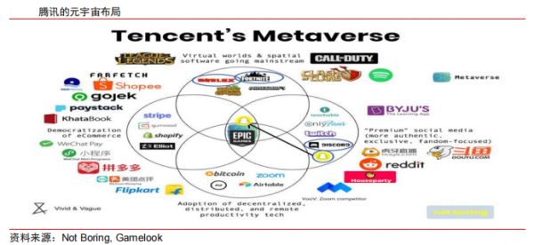 从更长远的角度来看,腾讯通过自身业务和对外投资,已开启了元宇宙布局。腾讯自身业务沿着游戏+社交、内容和基础设施三条主线布局元宇宙,同时通过对外投资围绕元宇宙不断补全拼图。