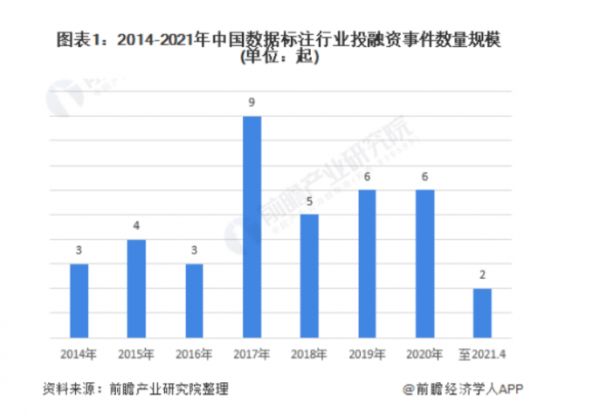 也正是在刘梦缘入行的2018年,数据标注公司的风口来临。根据前瞻产业研究院统计,2017年数据标注相关融资事件达到9起,到2021年4月,共有18家公司获得融资,投融资事件39起。
