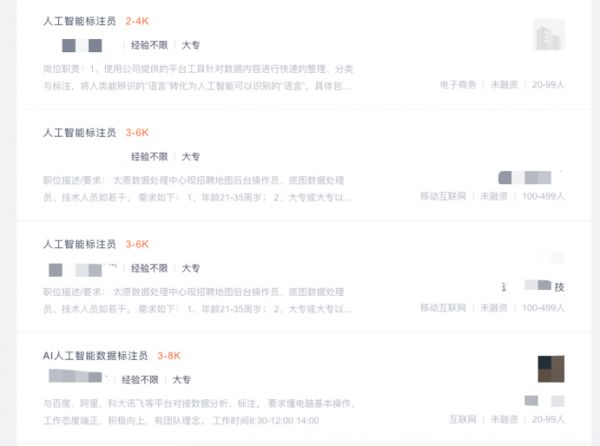 AI快速发展的背后,一批批“老师”换血,流动率相当高。“做文本标注的人员,现在越来越少,图像标注的30%的流动率,语音、视频常年都是对半开。而且现在的95后、00后愿意做的人少了,一般呆过三个月就不愿意继续干了”。