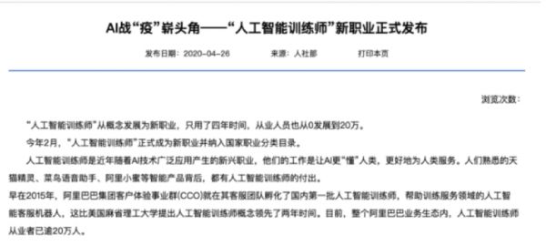 2020年4月26日,人力资源与社会保障部发文正式宣布,“人工智能训练师”正式成为新职业,并纳入国家职业分类目录。预计到2022年,国内外相关从业人员有望达到500万。