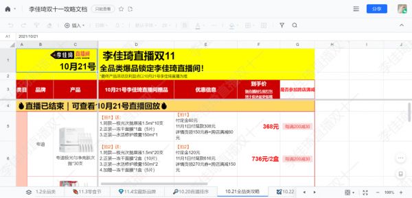 就拿上文提到双十一来说,不仅仅是李佳琦和薇娅,各大平台、品牌官方都相继推出了“爆款清单”、“内部资料”、“最佳攻略”,无一例外都是基于在线文档进行品牌优惠信息传播。