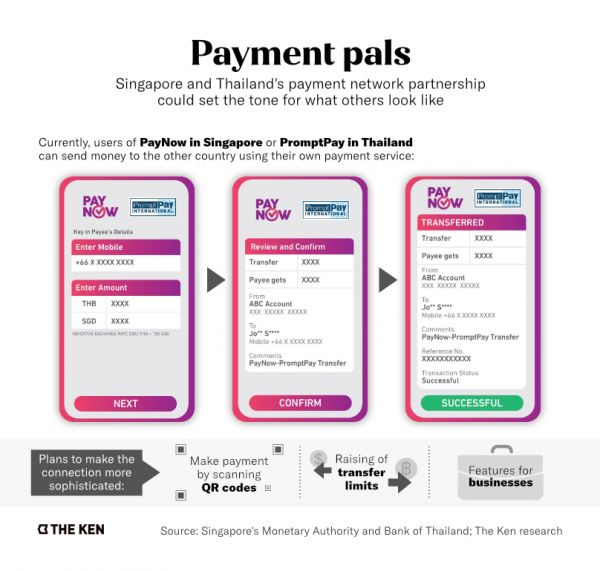 2021年4月,新加坡的PayNow和泰国的PromptPay宣布一项合作,允许两家平台的用户每天向彼此支付至多1000新元(合25000泰铢或741美元)。最初,它只能通过银行转账,但打算扩大范围,包括推出已被广泛接受的二维码等。