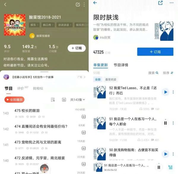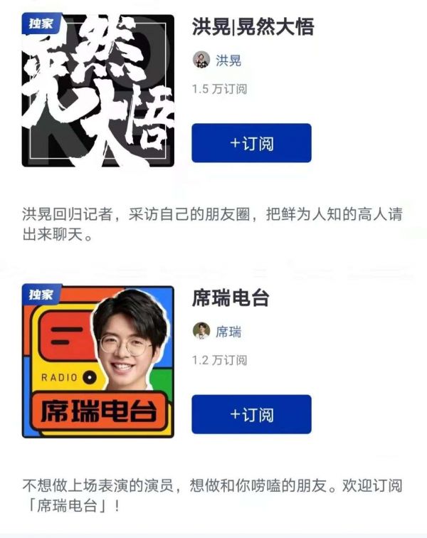 第三类就是IP型播客,主要以名人创作为亮点。比较有名的就是洪晃的《晃然大悟》,撕掉媒体和公众给她贴上的标签,从内容和知识本身出发,给观众耳目一新的感觉。《奇葩说》选手席瑞也在播客上展开对亲密关系的反思与总结,独特观点吸引了超过1.2万的订阅者。