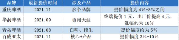 据统计,2021上半年华润啤酒吨成本同比增长4.1%;2021年三季度青岛啤酒、百威亚太的吨成本同比上升6.9%、3.4%,各品牌在不同程度承压,也直接导致了通往下游市场单品价格的上涨。