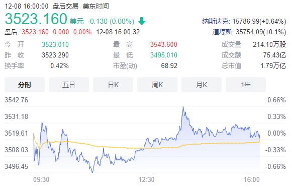 截至当地时间12月8日收盘,亚马逊股价报收3523.16美元,与前一日基本持平,总市值1.79万亿美元。