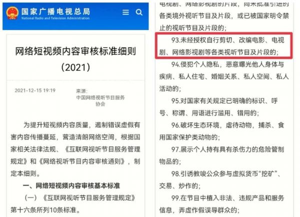 12月15日,国家广电总局官网发布了《网络短视频内容审核标准细则(2021)》,其中明确提到,短视频未经授权不得自行剪切、改编电影、电视剧、网络影视剧等各类视听节目及片段。