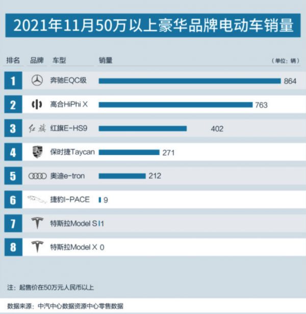 数据显示,11月一汽新能源旗舰车型红旗E-HS9以402辆的销量位居50万以上豪华品牌电动车销量榜第三。