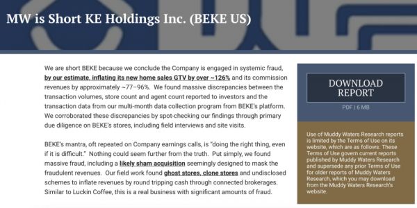 浑水在一份并不长的公告中指出, 贝壳正在大幅夸大其平台上新房销售的GTV(总交易额)以及由此产生的佣金收入。