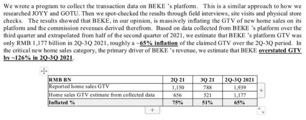 浑水估计,在关键的新房销售类别中,贝壳在2021年第二季度至第三季度将 GTV高估了约 126%。
